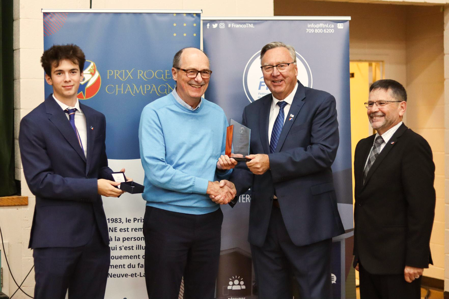 De gauche à droite : Tristan Claveau (président de Franco-Jeunes), Michael Clair (récipiendaire du prix Roger-Champagne), l'honorable Tony Wakeham premier ministre désigné de Terre-Neuve-et-Labrador, Tony Cornect président de la FFTNL.